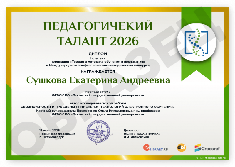 Международный профессионально-методический конкурс ПЕДАГОГИЧЕКИЙ ТАЛАНТ 2026 Код конкурса: НИК-638 Дата проведения: 15 июня 2026 г. К участию в конкурсе принимаются статьи объемом от 5 до 12 страниц на русском и английском языках. Авторами одной конкурсной работы могут быть несколько человек. По итогам конкурса его участники получают: 1. Публикацию своей конкурсной работы (статьи) в сборнике статей конкурса «ПЕДАГОГИЧЕКИЙ ТАЛАНТ 2026». Сборнику присваиваются УДК, ББК, ISBN; 2. Именные Дипломы (I, II или III степени) по решению редколлегии; 3. Размещение сборника и публикации участника в Научной электронной библиотеке eLIBRARY (Договор №467-03/2018K); 4. DOI - международный цифровой идентификатор публикации (см. условия участия); 5. Бесплатный сборник статей конкурса «ПЕДАГОГИЧЕКИЙ ТАЛАНТ 2026» (в электронном виде); 6. По итогам конкурсов предоставляется выписка из Протокола рассмотрения и оценки конкурсных работ и другие необходимые для отчетности документы (по запросу участника). Сборник статей конкурса формируется в течение 5 дней после окончания приема конкурсных работ (статей) и будет размещен на нашем сайте в разделе Архив конкурсов. Оргвзнос: 790 руб. |