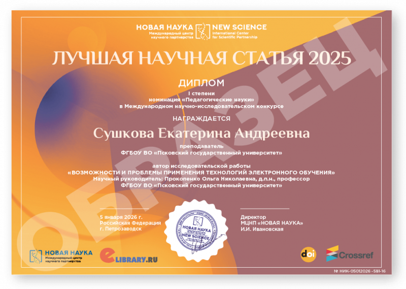Международный научно-исследовательский конкурс ЛУЧШАЯ НАУЧНАЯ СТАТЬЯ 2025 Код конкурса: НИК-581 Дата проведения: 5 января 2026 г. К участию в конкурсе принимаются статьи объемом от 5 до 12 страниц на русском и английском языках. Авторами одной конкурсной работы могут быть несколько человек. По итогам конкурса его участники получают: 1. Публикацию своей конкурсной работы (статьи) в сборнике статей конкурса «ЛУЧШАЯ НАУЧНАЯ СТАТЬЯ 2025». Сборнику присваиваются УДК, ББК, ISBN; 2. Именные Дипломы (I, II или III степени) по решению редколлегии; 3. Размещение сборника и публикации участника в Научной электронной библиотеке eLIBRARY (Договор №467-03/2018K); 4. DOI - международный цифровой идентификатор публикации (см. условия участия); 5. Бесплатный сборник статей конкурса «ЛУЧШАЯ НАУЧНАЯ СТАТЬЯ 2025» (в электронном виде); 6. По итогам конкурсов предоставляется выписка из Протокола рассмотрения и оценки конкурсных работ и другие необходимые для отчетности документы (по запросу участника). Сборник статей конкурса формируется в течение 5 дней после окончания приема конкурсных работ (статей) и будет размещен на нашем сайте в разделе Архив конкурсов. Оргвзнос: 990 руб. |