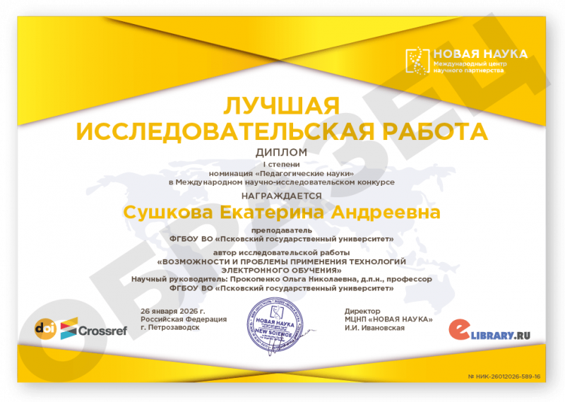 Международный научно-исследовательский конкурс ЛУЧШАЯ ИССЛЕДОВАТЕЛЬСКАЯ РАБОТА Код конкурса: НИК-589 Дата проведения: 26 января 2026 г. К участию в конкурсе принимаются статьи объемом от 5 до 12 страниц на русском и английском языках. Авторами одной конкурсной работы могут быть несколько человек. По итогам конкурса его участники получают: 1. Публикацию своей конкурсной работы (статьи) в сборнике статей конкурса «ЛУЧШАЯ ИССЛЕДОВАТЕЛЬСКАЯ РАБОТА». Сборнику присваиваются УДК, ББК, ISBN; 2. Именные Дипломы (I, II или III степени) по решению редколлегии; 3. Размещение сборника и публикации участника в Научной электронной библиотеке eLIBRARY (Договор №467-03/2018K); 4. DOI - международный цифровой идентификатор публикации (см. условия участия); 5. Бесплатный сборник статей конкурса «ЛУЧШАЯ ИССЛЕДОВАТЕЛЬСКАЯ РАБОТА» (в электронном виде); 6. По итогам конкурсов предоставляется выписка из Протокола рассмотрения и оценки конкурсных работ и другие необходимые для отчетности документы (по запросу участника). Сборник статей конкурса формируется в течение 5 дней после окончания приема конкурсных работ (статей) и будет размещен на нашем сайте в разделе Архив конкурсов. Оргвзнос: 990 руб. |