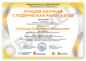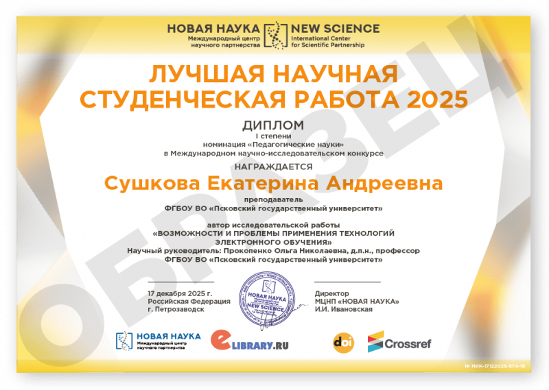 Международный научно-исследовательский конкурс ЛУЧШАЯ НАУЧНАЯ СТУДЕНЧЕСКАЯ РАБОТА 2025 Код конкурса: НИК-574 Дата проведения: 17 декабря 2025 г. К участию в конкурсе принимаются статьи объемом от 5 до 12 страниц на русском и английском языках. Авторами одной конкурсной работы могут быть несколько человек. По итогам конкурса его участники получают: 1. Публикацию своей конкурсной работы (статьи) в сборнике статей конкурса «ЛУЧШАЯ НАУЧНАЯ СТУДЕНЧЕСКАЯ РАБОТА 2025». Сборнику присваиваются УДК, ББК, ISBN; 2. Именные Дипломы (I, II или III степени) по решению редколлегии; 3. Размещение сборника и публикации участника в Научной электронной библиотеке eLIBRARY (Договор №467-03/2018K); 4. DOI - международный цифровой идентификатор публикации (см. условия участия); 5. Бесплатный сборник статей конкурса «ЛУЧШАЯ НАУЧНАЯ СТУДЕНЧЕСКАЯ РАБОТА 2025» (в электронном виде); 6. По итогам конкурсов предоставляется выписка из Протокола рассмотрения и оценки конкурсных работ и другие необходимые для отчетности документы (по запросу участника). Сборник статей конкурса формируется в течение 5 дней после окончания приема конкурсных работ (статей) и будет размещен на нашем сайте в разделе Архив конкурсов. Оргвзнос: 990 руб. |