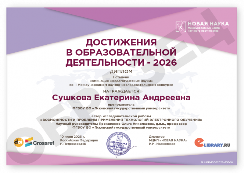 II Международный научно-исследовательский конкурс ДОСТИЖЕНИЯ В ОБРАЗОВАТЕЛЬНОЙ ДЕЯТЕЛЬНОСТИ - 2026 Код конкурса: НИК-636 Дата проведения: 10 июня 2026 г. К участию в конкурсе принимаются статьи объемом от 5 до 12 страниц на русском и английском языках. Авторами одной конкурсной работы могут быть несколько человек. По итогам конкурса его участники получают: 1. Публикацию своей конкурсной работы (статьи) в сборнике статей конкурса «ДОСТИЖЕНИЯ В ОБРАЗОВАТЕЛЬНОЙ ДЕЯТЕЛЬНОСТИ - 2026». Сборнику присваиваются УДК, ББК, ISBN; 2. Именные Дипломы (I, II или III степени) по решению редколлегии; 3. Размещение сборника и публикации участника в Научной электронной библиотеке eLIBRARY (Договор №467-03/2018K); 4. DOI - международный цифровой идентификатор публикации (см. условия участия); 5. Бесплатный сборник статей конкурса «ДОСТИЖЕНИЯ В ОБРАЗОВАТЕЛЬНОЙ ДЕЯТЕЛЬНОСТИ - 2026» (в электронном виде); 6. По итогам конкурсов предоставляется выписка из Протокола рассмотрения и оценки конкурсных работ и другие необходимые для отчетности документы (по запросу участника). Сборник статей конкурса формируется в течение 5 дней после окончания приема конкурсных работ (статей) и будет размещен на нашем сайте в разделе Архив конкурсов. Оргвзнос: 890 руб. |
