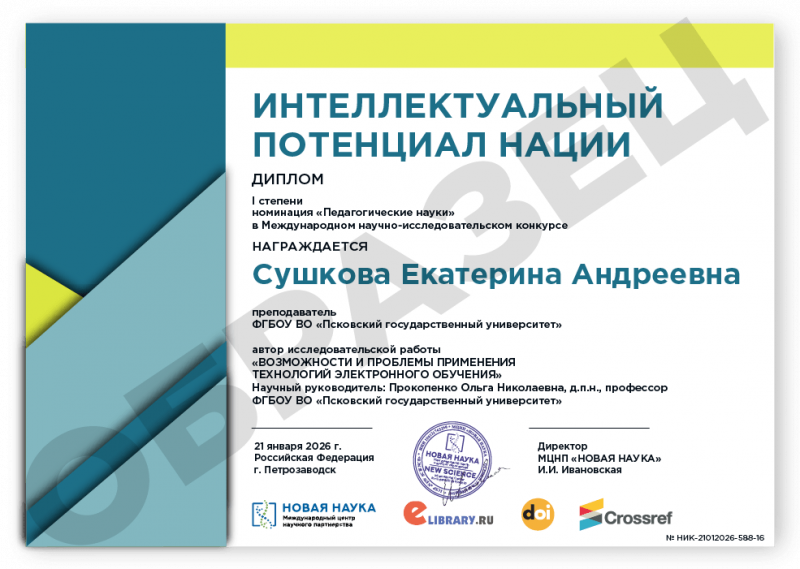 Международный научно-исследовательский конкурс ИНТЕЛЛЕКТУАЛЬНЫЙ ПОТЕНЦИАЛ НАЦИИ Код конкурса: НИК-588 Дата проведения: 21 января 2026 г. К участию в конкурсе принимаются статьи объемом от 5 до 12 страниц на русском и английском языках. Авторами одной конкурсной работы могут быть несколько человек. По итогам конкурса его участники получают: 1. Публикацию своей конкурсной работы (статьи) в сборнике статей конкурса «ИНТЕЛЛЕКТУАЛЬНЫЙ ПОТЕНЦИАЛ НАЦИИ». Сборнику присваиваются УДК, ББК, ISBN; 2. Именные Дипломы (I, II или III степени) по решению редколлегии; 3. Размещение сборника и публикации участника в Научной электронной библиотеке eLIBRARY (Договор №467-03/2018K); 4. DOI - международный цифровой идентификатор публикации (см. условия участия); 5. Бесплатный сборник статей конкурса «ИНТЕЛЛЕКТУАЛЬНЫЙ ПОТЕНЦИАЛ НАЦИИ» (в электронном виде); 6. По итогам конкурсов предоставляется выписка из Протокола рассмотрения и оценки конкурсных работ и другие необходимые для отчетности документы (по запросу участника). Сборник статей конкурса формируется в течение 5 дней после окончания приема конкурсных работ (статей) и будет размещен на нашем сайте в разделе Архив конкурсов. Оргвзнос: 890 руб. |