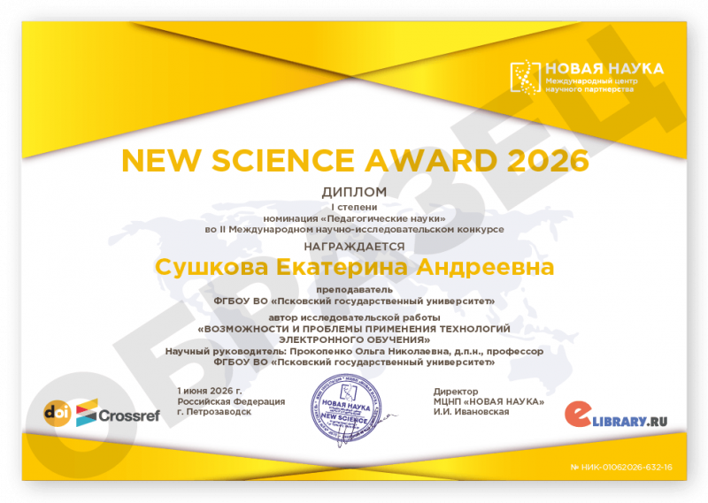 II Международный научно-исследовательский конкурс NEW SCIENCE AWARD 2026 Код конкурса: НИК-632 Дата проведения: 1 июня 2026 г. К участию в конкурсе принимаются статьи объемом от 5 до 12 страниц на русском и английском языках. Авторами одной конкурсной работы могут быть несколько человек. По итогам конкурса его участники получают: 1. Публикацию своей конкурсной работы (статьи) в сборнике статей конкурса «NEW SCIENCE AWARD 2026». Сборнику присваиваются УДК, ББК, ISBN; 2. Именные Дипломы (I, II или III степени) по решению редколлегии; 3. Размещение сборника и публикации участника в Научной электронной библиотеке eLIBRARY (Договор №467-03/2018K); 4. DOI - международный цифровой идентификатор публикации (см. условия участия); 5. Бесплатный сборник статей конкурса «NEW SCIENCE AWARD 2026» (в электронном виде); 6. По итогам конкурсов предоставляется выписка из Протокола рассмотрения и оценки конкурсных работ и другие необходимые для отчетности документы (по запросу участника). Сборник статей конкурса формируется в течение 5 дней после окончания приема конкурсных работ (статей) и будет размещен на нашем сайте в разделе Архив конкурсов. Оргвзнос: 990 руб. |