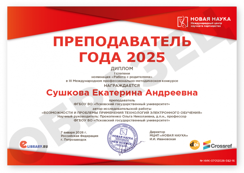 III Международный профессионально-методический конкурс ПРЕПОДАВАТЕЛЬ ГОДА 2025 Дата проведения: 7 января 2026 г. К участию в конкурсе принимаются статьи объемом от 5 до 12 страниц на русском и английском языках. Авторами одной конкурсной работы могут быть несколько человек. По итогам Конкурса его участники получают: 1. Публикацию конкурсной работы (статьи) в сборнике статей конкурса «ПРЕПОДАВАТЕЛЬ ГОДА 2025». Сборнику присваиваются УДК, ББК, ISBN; 2. Бесплатные именные Дипломы (I, II или III степени) по решению редколлегии; 4. Размещение сборника и публикации участника в Научной электронной библиотеке eLIBRARY (Договор №467-03/2018K) в открытом доступе; 5. DOI - международный цифровой идентификатор публикации (см. условия участия); 6. По итогам Конкурса предоставляется выписка из Протокола рассмотрения и оценки конкурсных работ, выписка из Приказа и другие необходимые документы (по запросу участника). Сборник статей конкурса формируется в течение 5-10 дней после окончания приема конкурсных статей и будет размещен на нашем сайте в разделе Архив конкурсов. Об итогах конкурса участники дополнительно будут проинформированы по электронной почте. Оргвзнос - 890 руб. |