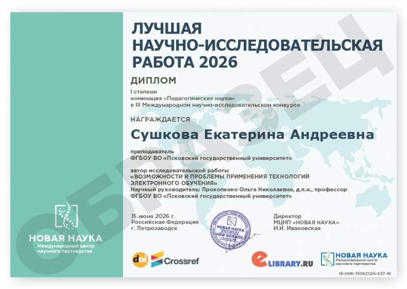 III Международный научно-исследовательский конкурс ЛУЧШАЯ НАУЧНО-ИССЛЕДОВАТЕЛЬСКАЯ РАБОТА 2026 Код конкурса: НИК-637 Дата проведения: 15 июня 2026 г. К участию в конкурсе принимаются статьи объемом от 5 до 12 страниц на русском и английском языках. Авторами одной конкурсной работы могут быть несколько человек. По итогам конкурса его участники получают: 1. Публикацию своей конкурсной работы (статьи) в сборнике статей конкурса «ЛУЧШАЯ НАУЧНО-ИССЛЕДОВАТЕЛЬСКАЯ РАБОТА 2026». Сборнику присваиваются УДК, ББК, ISBN; 2. Именные Дипломы (I, II или III степени) по решению редколлегии; 3. Размещение сборника и публикации участника в Научной электронной библиотеке eLIBRARY (Договор №467-03/2018K); 4. DOI - международный цифровой идентификатор публикации (см. условия участия); 5. Бесплатный сборник статей конкурса «ЛУЧШАЯ НАУЧНО-ИССЛЕДОВАТЕЛЬСКАЯ РАБОТА 2026» (в электронном виде); 6. По итогам конкурсов предоставляется выписка из Протокола рассмотрения и оценки конкурсных работ и другие необходимые для отчетности документы (по запросу участника). Сборник статей конкурса формируется в течение 5 дней после окончания приема конкурсных работ (статей) и будет размещен на нашем сайте в разделе Архив конкурсов. Оргвзнос: 990 руб. |